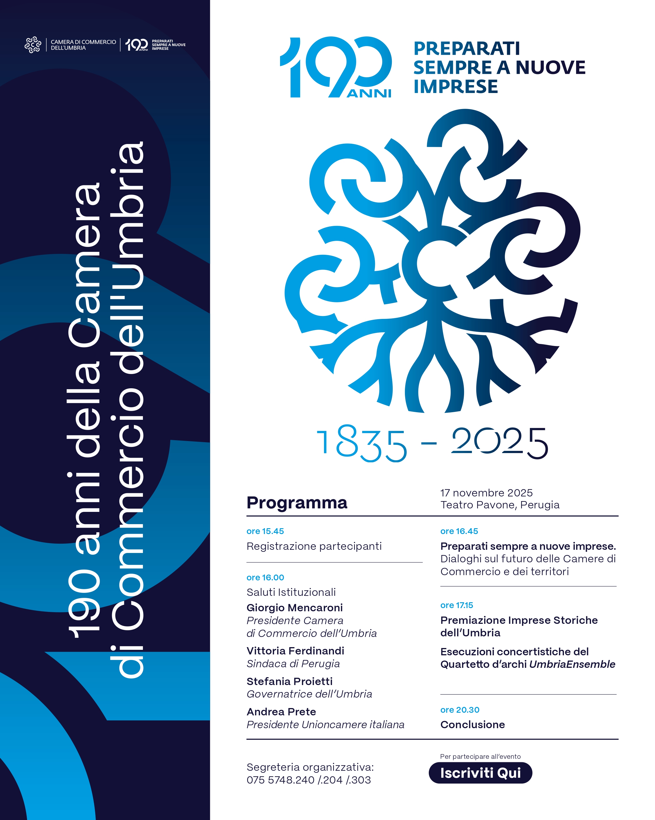 In occasione del suo 190° anniversario (1835-2025), la Camera di Commercio dell'Umbria organizza un evento celebrativo che si terrà lunedì 17 novembre 2025, a partire dalle ore 15.45, presso il Teatro Pavone di Perugia.