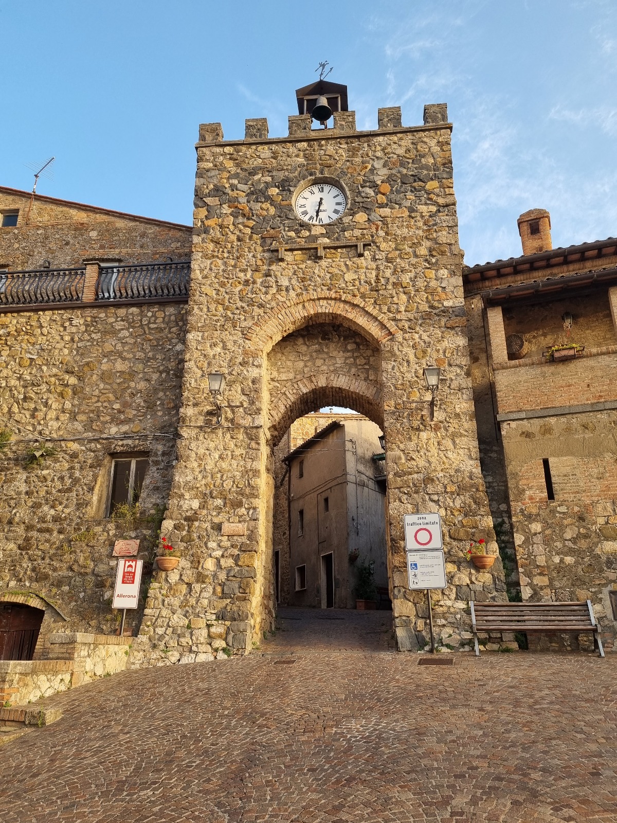 Al mattino, dopo aver fatto colazione nel cortile del palazzo, mi incontro con Liz, che mi accompagna in auto per una decina di chilometri fino ad Allerona, un agglomerato di case in pietra su una cima scoscesa, circondata da robusti bastioni. Cade una pioggia fine e leggera. La valle sottostante è avvolta nella nebbia. Liz mi dice di non fermarmi sotto la torre dell'orologio. Si dice che porti sfortuna starci sotto quando suona. Saliamo a piedi fino al mio alloggio, un accogliente rifugio chiamato Bed & Basta. Si trova in una piazza acciottolata, di fronte a una chiesa medievale - austera all'esterno, ornata all'interno. Liz e Paolo si sono sposati qui.